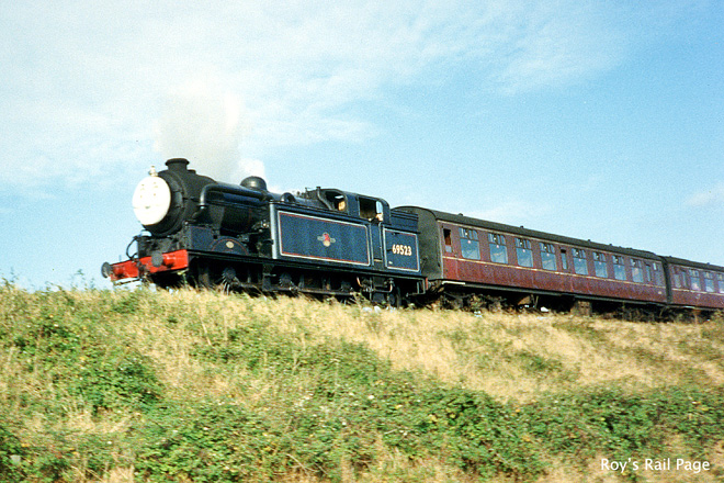 Restored N2 0-6-2T No. 69523 is seen in B.R. lined black livery and a 'Thomas' face near Sheringham in October 1997.
