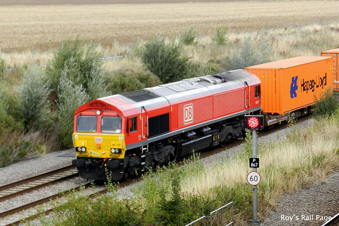 DB Schenker red liveried Class 66 No. 66137 passes Werrington on the 28th of August 2025