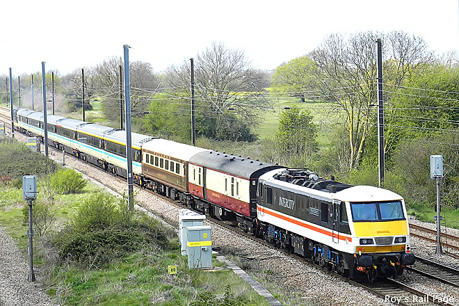 Class 90 No. 90001 named 'Royal Scot' at Marholm on the 21st of April 2023.