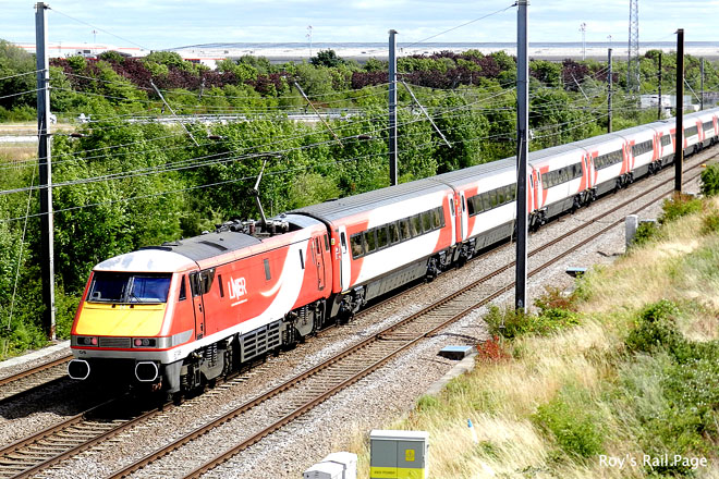 L.N.E.R. red liveried Class 91 No. 91106 passes Marholm northbound on the 2nd of August 2022.