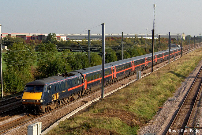 GNER navy blue liveried Class 91, No. 91114 named 'St Mungo Cathedral' passes Marholm on the 10th of October 2005.